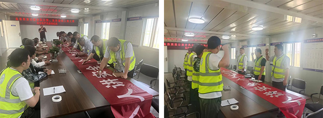 在鹽洛高速步鳳互通項目會議室,項目安全負(fù)責(zé)人結(jié)合“安全生產(chǎn)月”活動方案要求,對“安全生產(chǎn)月”工作進(jìn)行了詳細(xì)部署;隨后,全體與會人員高舉右手,進(jìn)行了莊嚴(yán)宣誓,展示了大家對于安全生產(chǎn)工作的堅定信念和決心,并在“人人講安全、個個會應(yīng)急——暢通生命通道”的主題條幅上鄭重署名。